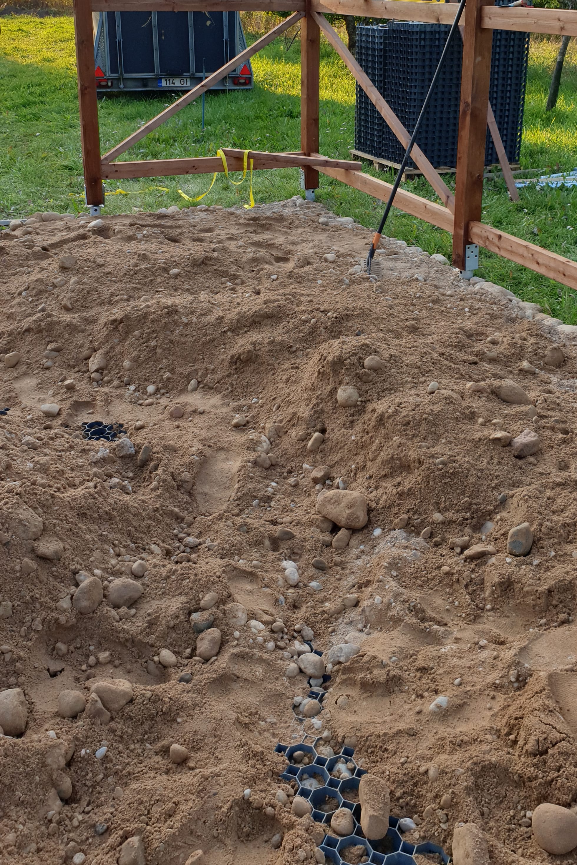Building a stable in Estonia is a battle against the elements. To prevent the area from turning into a "mud smoothie," we reinforced the ground under the shelter with heavy-duty plastic grids—those honeycomb thingies that prevent hooves from churning the earth into a bog. We filled the cells with sand to create a stable, permeable surface that stays dry even when the autumn rains hit.