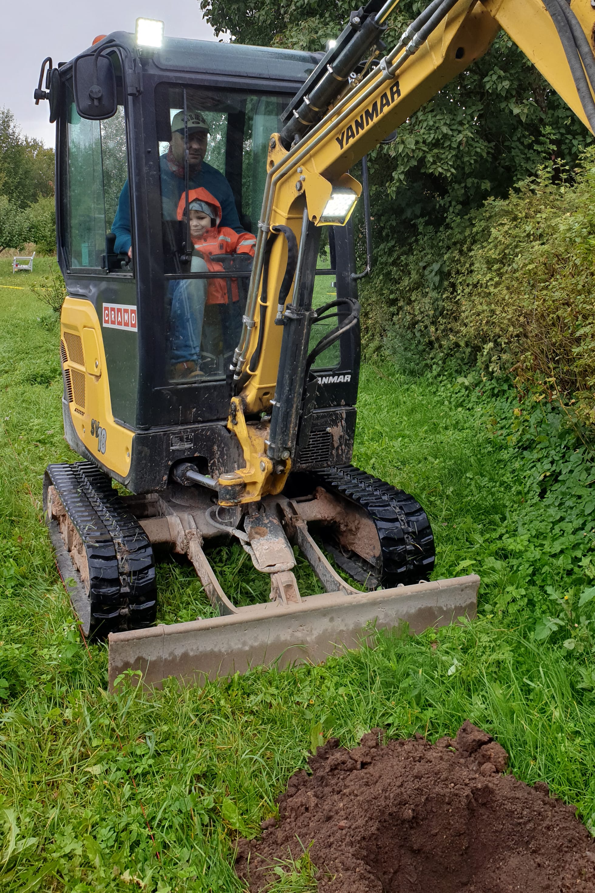Then came the "umbilical cord"—water and electricity. We rented a mini-excavator, allowing Marti to fulfill his dream of being a heavy machinery operator (while simultaneously babysitting three-year-old Leon, because boys and tractors are an inseparable duo).