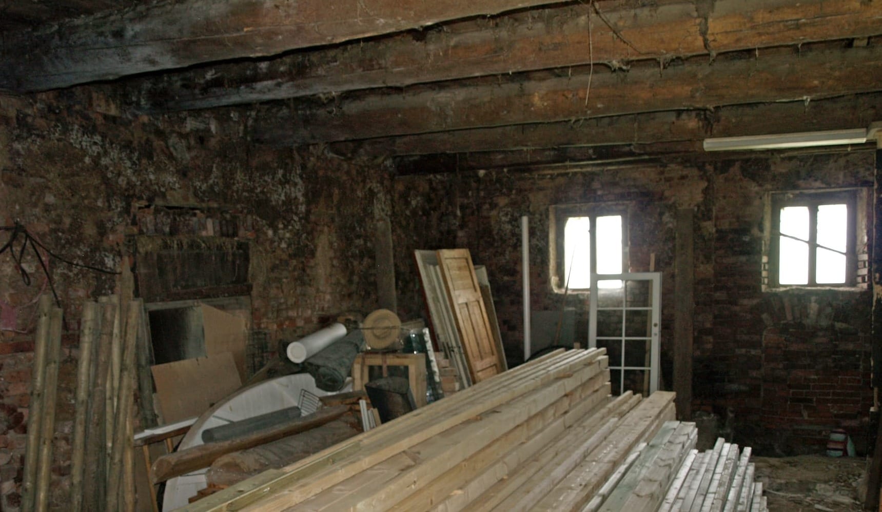 Above what is now the stable, those original cross-beams had rotted away completely. Because the exterior walls had also begun to crumble, the previous "fix" was a structural nightmare: new beams had been installed, but since there was no solid outer wall left to support them, they were simply rested on the internal walls, running lengthwise.