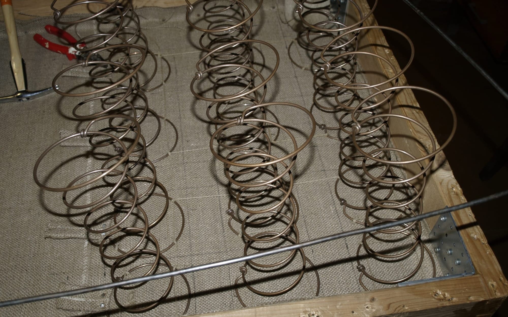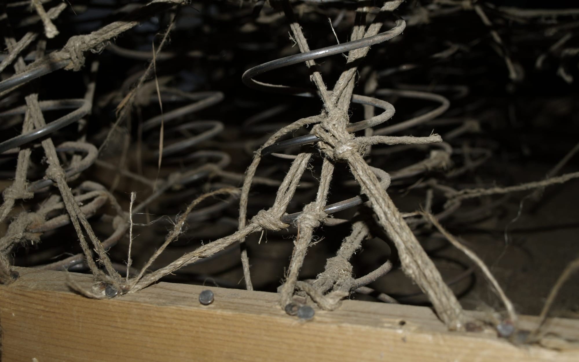 The Web of Tension: Using a high-quality Italian flax twine, Heiko had to tie each spring to its neighbor and then to the sofa frame in eight different directions (diagonal, horizontal, and vertical).